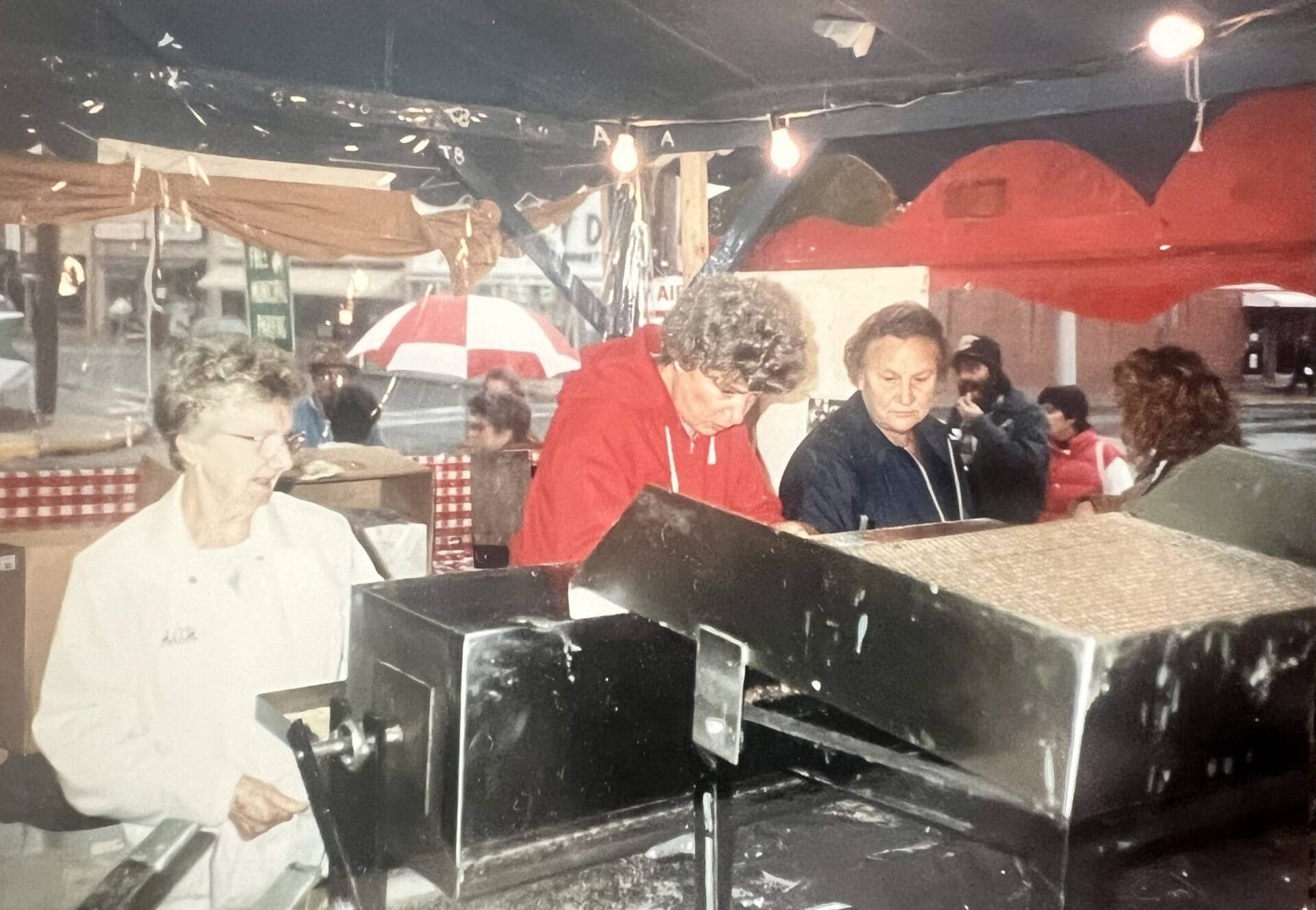 That autumn, Southington held its first Apple Harvest Festival, and Zion Lutheran’s apple fritters made their debut. In those early years, the operation was truly homespun. Dot Czarnota herself oversaw much of the prep work – volunteers gathered at her home to peel bushels of apples and mix vast quantities of batter by hand. At the festival booth, the fritters were fried on the spot, originally scooped into the hot oil with teaspoons (later upgraded to ice-cream scoops) for consistency. Each warm, cinnamon-dusted fritter sold for just ten cents back then. The affordable price and indulgent aroma drew curiosity, but it was the first bite that hooked festivalgoers. Before long, Dot’s apple fritters became the surprise hit of the festival’s debut year. What began as a modest church fundraiser quickly grew into a centerpiece of the Apple Harvest Festival – one that would endure for generations.